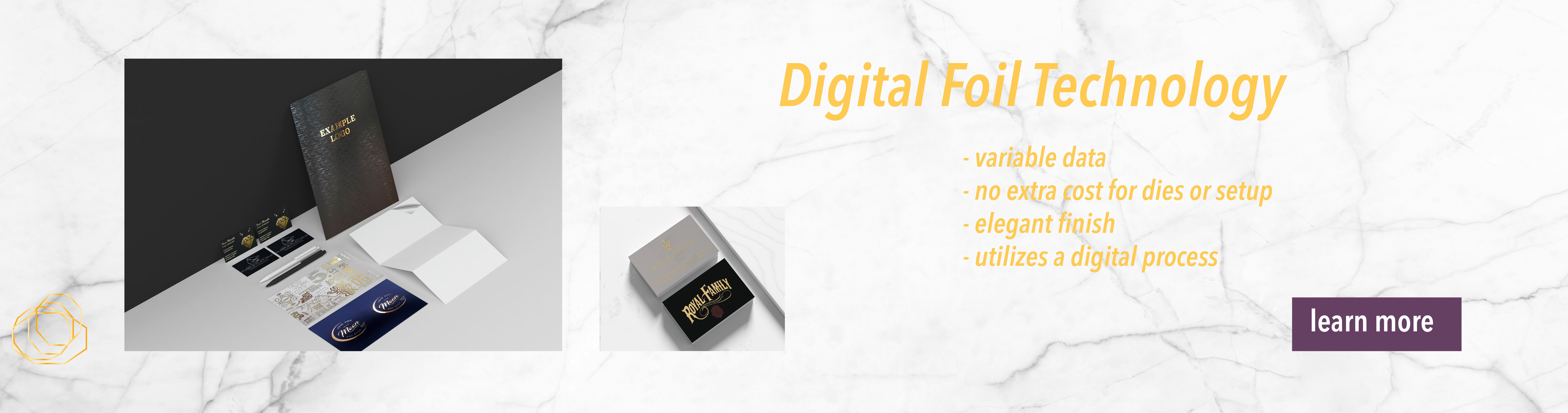 Presentation folders printed with Digital Foil continue print's tradition of tactile marketing with a focus on elegance, efficiency, and aesthetic. Digital Foil is a layer placed over Raised UV during the offline (post-print) process. It gives the effect of Traditional Foil with Embossing, but without the impression showing through the backside of the sheet - this allows logos and other cornerstone design elements to lift off the page, giving them a literal raised effect.