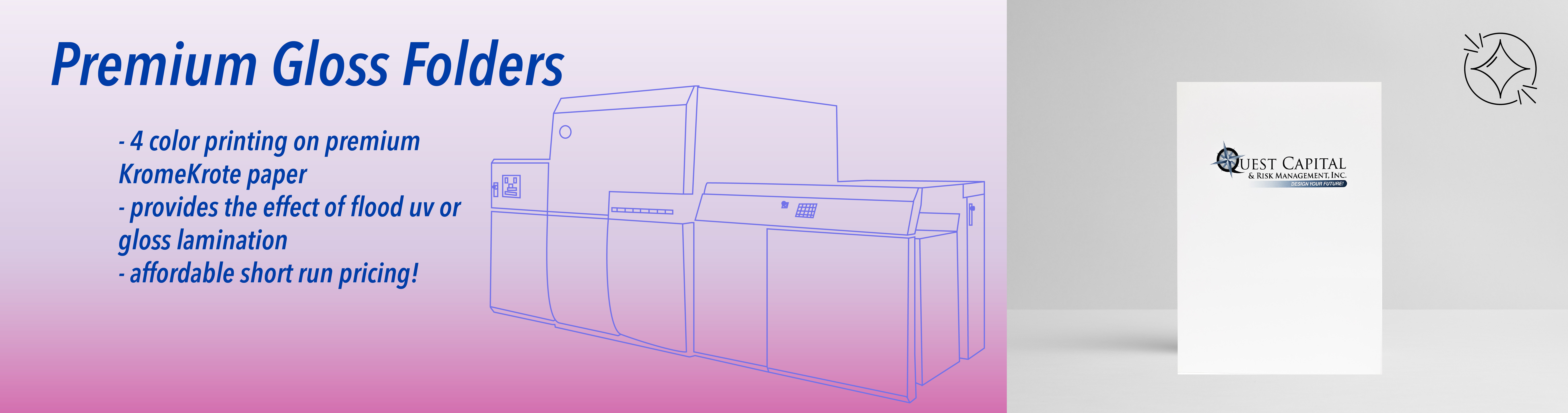 Custom folders printed full color on Kromekote paper provide an elegant gloss finish. Order as few as 25 folders and see the difference this paper and print process can provide for your branded marketing materials.