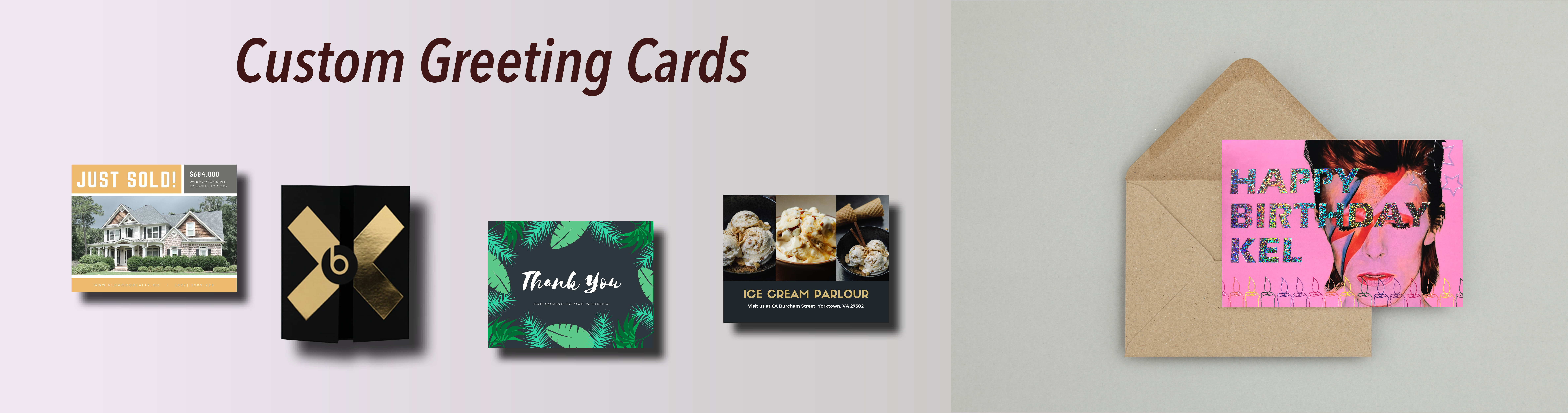 Greeting cards designed to stand out: 4 color printing paired with Soft Touch Lamination and your choice of Raised UV or Digital Foil. Have a custom product size or printing method? Please fill out a custom quote for pricing.