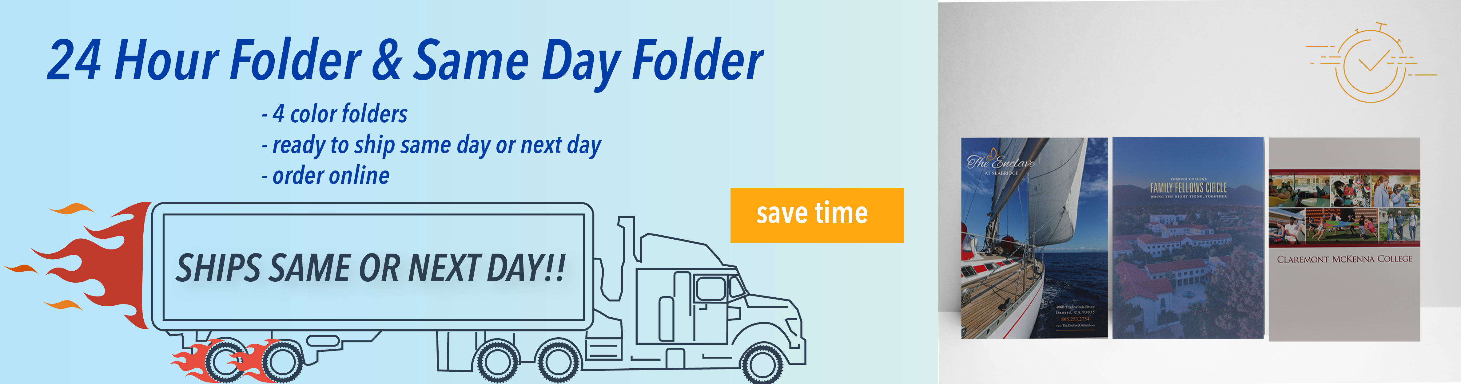 Custom pocket folders ready to ship fast! These full color pocket folders are ready to ship in 24 hours or same day. Submit your print-ready artwork files before 10:00 a.m. (PST) / 1:00 p.m. (EST) to secure this production time.