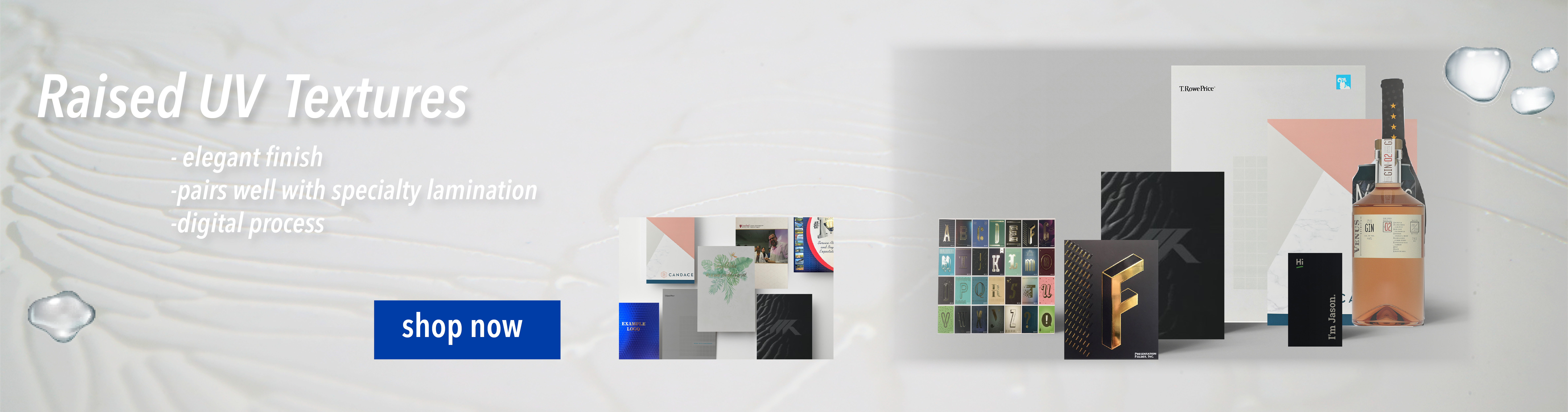 Raised UV Textures paired with full color Presentation Folders! Our Raised UV Textures make it easy for your client's design to stand out - choose one of our textures as a background layer in your folder. These folders have it all - full color printing, your choice of Matte Aqueous, Matte or Soft-Touch Lamination, and Raised UV.